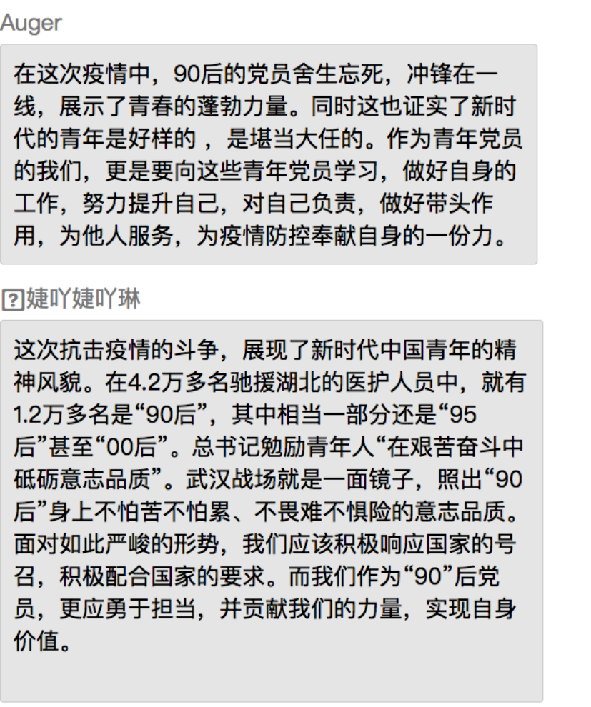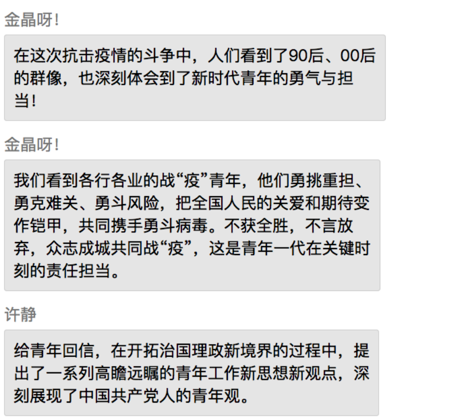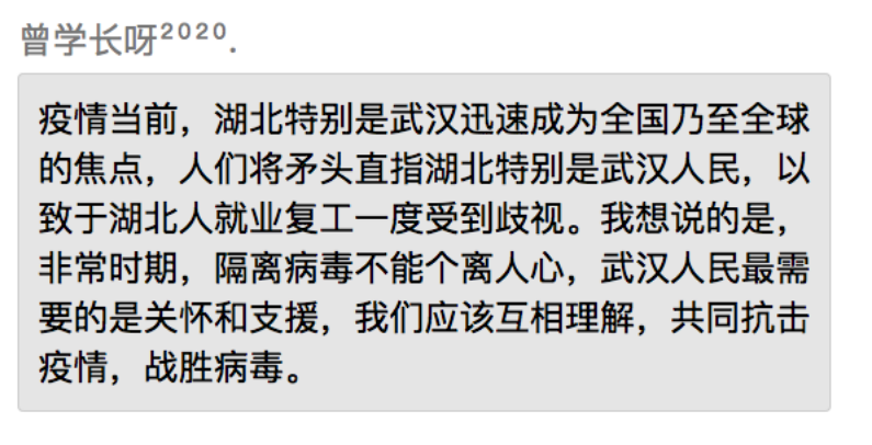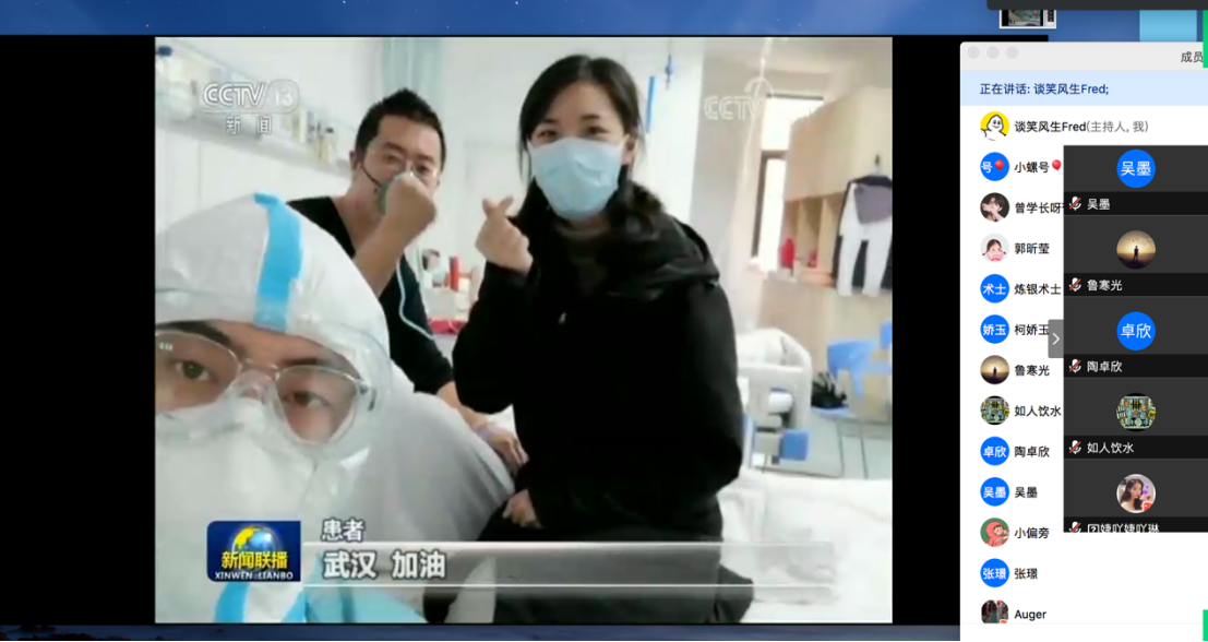 同学们表示,在党中央的坚强领导下,全国上下齐心协力共抗疫情,充分展现了中国特色社会主义制度的强大生命力和显著优越性,再一次见证了气势磅礴的中国力量、万众一心的中国精神和卓有成效的中国速率。作为新时代的中国青年,要勇做走在时代前列的奋进者、开拓者、奉献者,并积极配合政府、学校和社区,为打赢疫情防控阻击战贡献自己的力量。