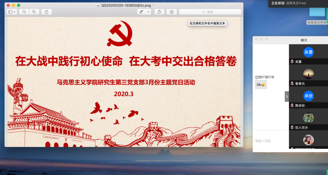 为深入学习贯彻习近平总书记关于疫情防控工作的重要指示,认真落实学校党委有关疫情防控工作要求,开展好疫情防控期间学生党支部建设,3月25日,yl23411集团研究生第三党支部利用腾讯会议平台,开展了“在大战中践行初心使命 在大考中交出合格答卷”3月份线上主题党日活动。