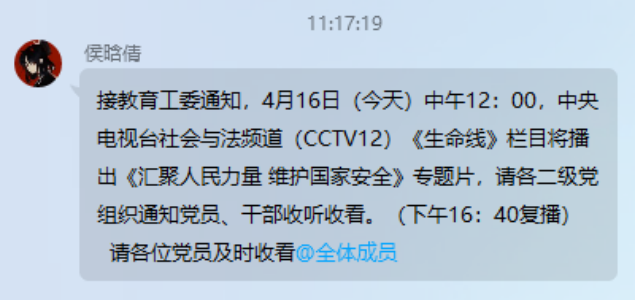 全体党员在观看央视推出的《汇聚人民力量 维护国家安全》“4.15”专题宣传片后,积极踊跃地分享自己的感悟、体会和看法。