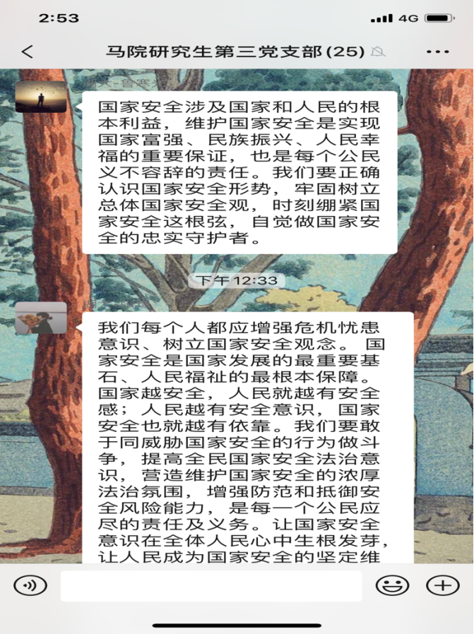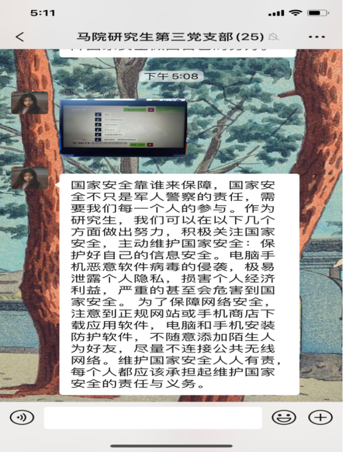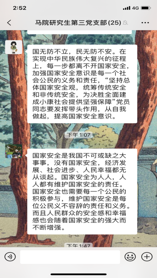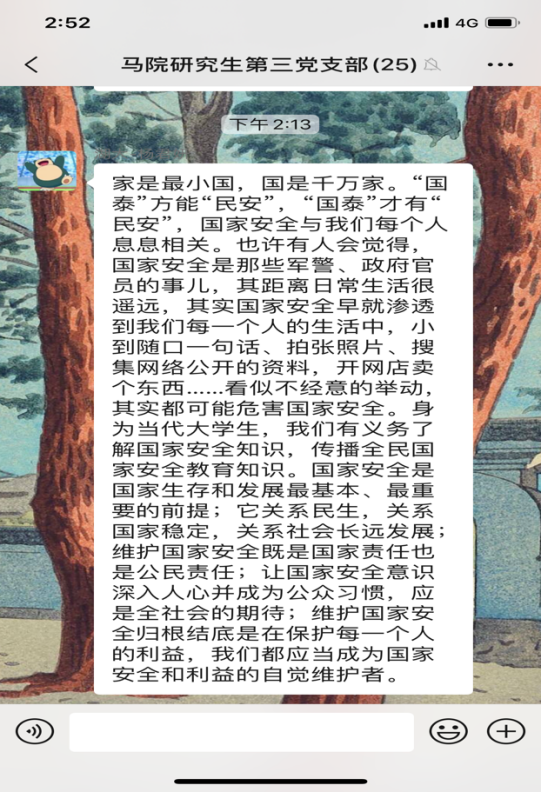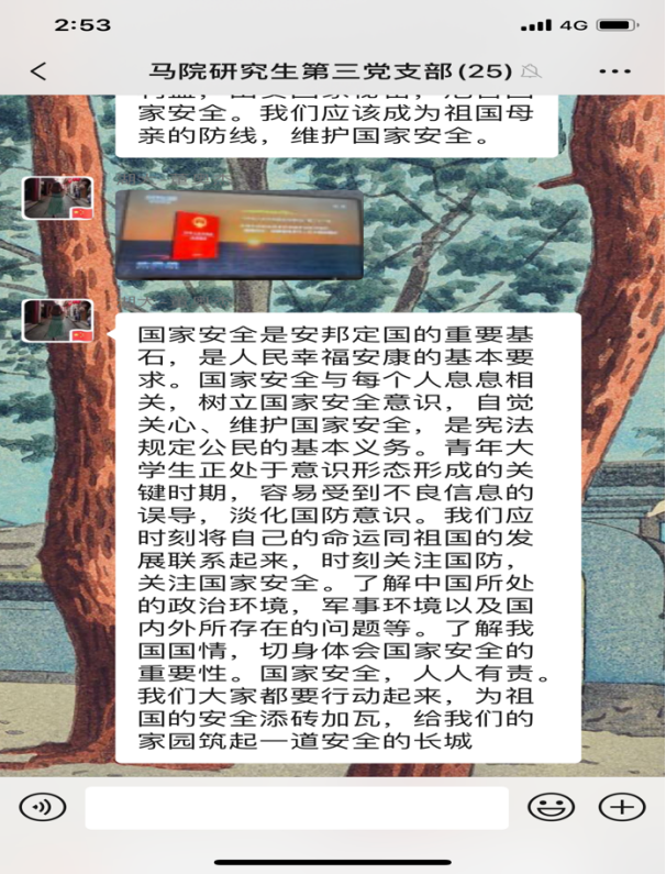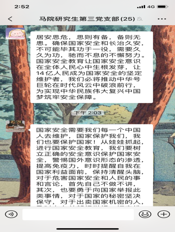 4月15日是第5个全民国家安全教育日,今年的活动主题是“坚持总体国家安全观,统筹传统安全和非传统安全,为决胜全面建成小康社会提供坚强保障”。为更好地开展国家安全教育,4月16日,yl23411集团研究生第三党支部开展4月份主题党日活动,全体党员同志观看《汇聚人民力量 维护国家安全》专题片。在观看后,同志们感触颇多,纷纷在支部微信群分享观后感。
