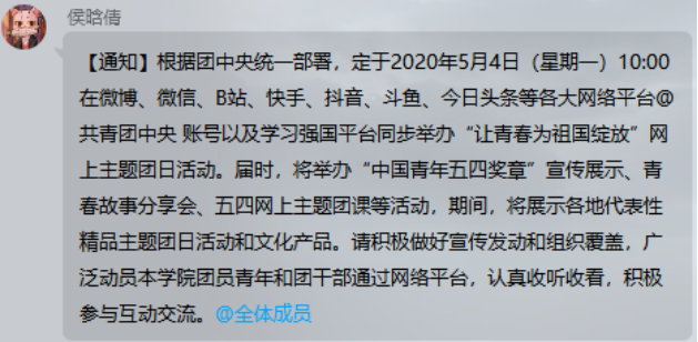 五四青年节之际,为激励广大青年党员时刻牢记习近平总书记嘱托,继承和发扬五四精神,yl23411集团本科生党支部于2020年5月4日通过观看网上直播的形式开展“让青春为祖国绽放”线上主题党日活动。