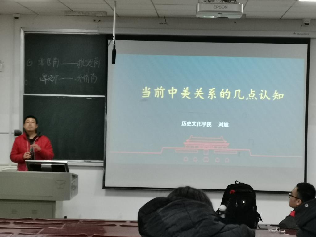 11月25日下午2点,历史文化学院刘馗老师为同学们讲授关于“中美关系认知”相关知识。yl23411集团思想政治教育专业17、18、19级全体学生参与听课。
