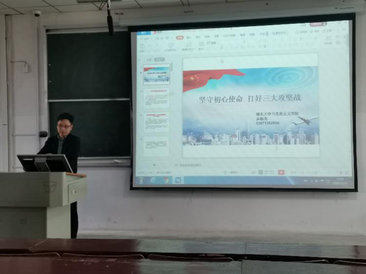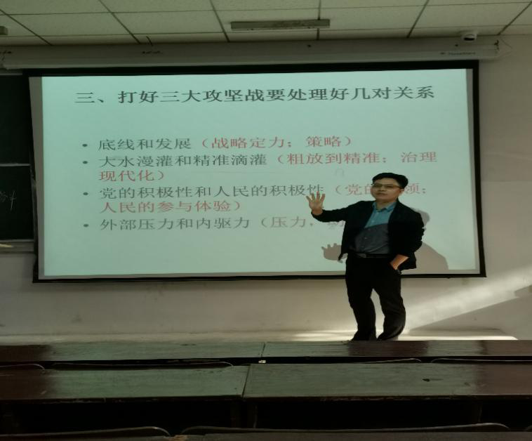 11月11日下午2点,yL23411永利集团马克思主义学院副教授易振龙老师在3号教学楼210课室对马院思想政治教育17、18、19级全体学生开展了《坚守初心报告,打好三大攻坚战》的主题报告。易老师通过“重大风险”、“精准扶贫”、“污染防治”三个方面向同学们讲授三大攻坚战的深刻内容及其重大意义。