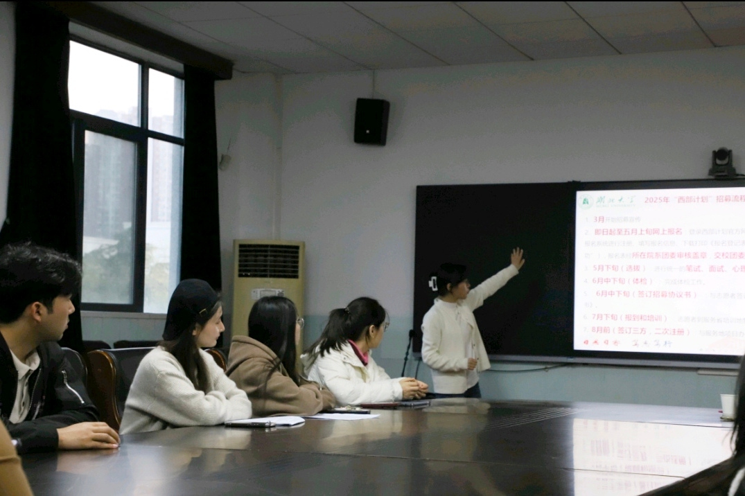 (通讯员:齐越凡)为响应国家号召,鼓励大学生深入基层、扎根基层,3月20日18:00,马院二号会议室举办了“2025年大学生志愿服务西部计划宣讲会”。会前,美娅莎尔・阿布都拉老师与学生交流,了解就业计划,鼓励大家将个人理想融入国家发展大局,在西部这片广袤的土地上绽放青春光芒。
