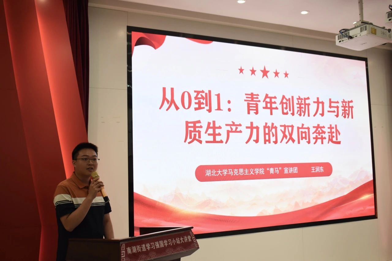 20日下午,活动走进武汉市“理论热点面对面”实践基地——武昌区南湖街道宝安社区。我院青马宣讲团团长王润东以“从0到1:青年创新力与新质生产力的双向奔赴”为题进行宣讲。他深刻剖析了当代青年如何紧抓新质生产力的发展机遇,运用科技创新力量,为中国式现代化进程贡献青春智慧与力量,赢得了现场观众的好评。