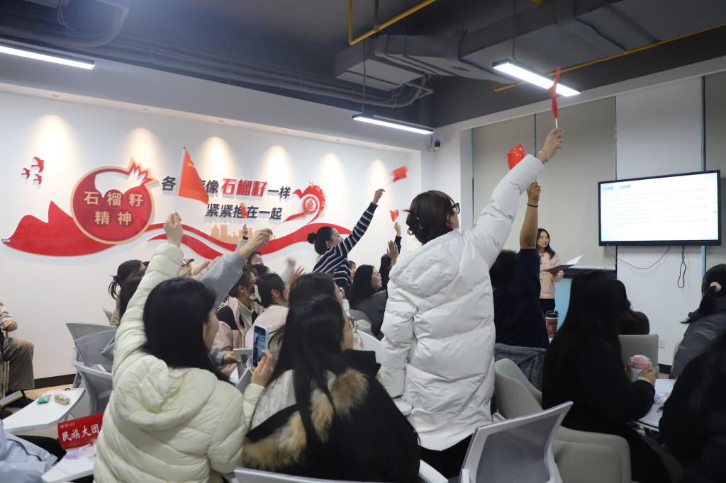 竞赛设置互动与答题两大环节。知识竞答题型涵盖选择、判断和简答,内容聚焦民族政策、风俗文化及相关理论,全面检验同学们对民族团结知识的理解与掌握。在“民族语言传话”互动环节中,同学们通过模拟多民族语言交流场景,切身感受中华文化的多样性与包容性,在轻松活泼的氛围中增强了文化认同与民族情感。答题过程中,各代表队手持红旗、踊跃抢答,现场气氛热烈,展现出团结协作、积极向上的精神风貌。