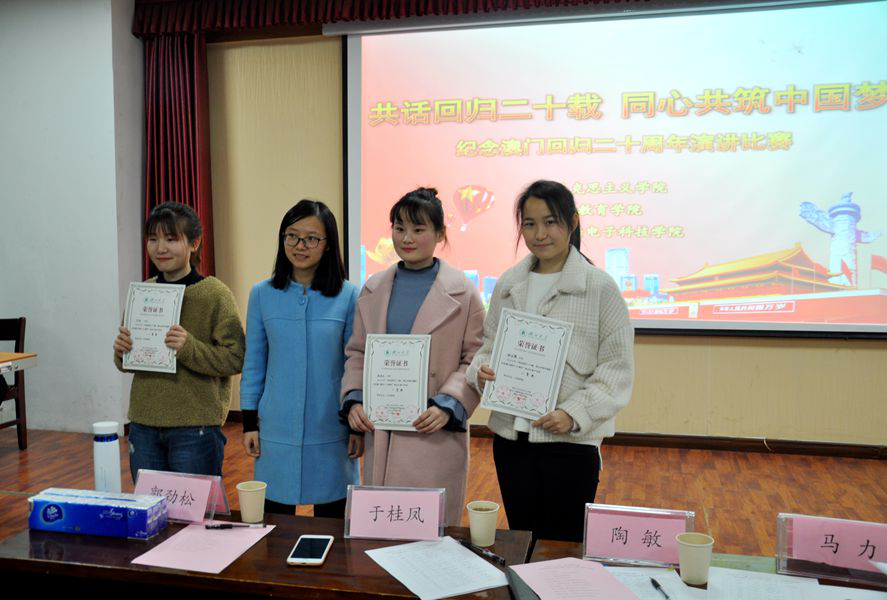 为纪念澳门回归二十周年,激荡广大青年学生的爱国情怀。12月13日下午,我院和物理与电子科技学院、教育学院在物理与电子科技学院314教室联合举办以“共话回归二十载·同心共筑中国梦”为主题的演讲比赛。yl23411集团郭劲松老师、于桂凤老师,物理与电子科技学院陶敏老师、教育学院马力老师受邀担任此次大赛的评委,三院50余名研究生参加了此次活动。