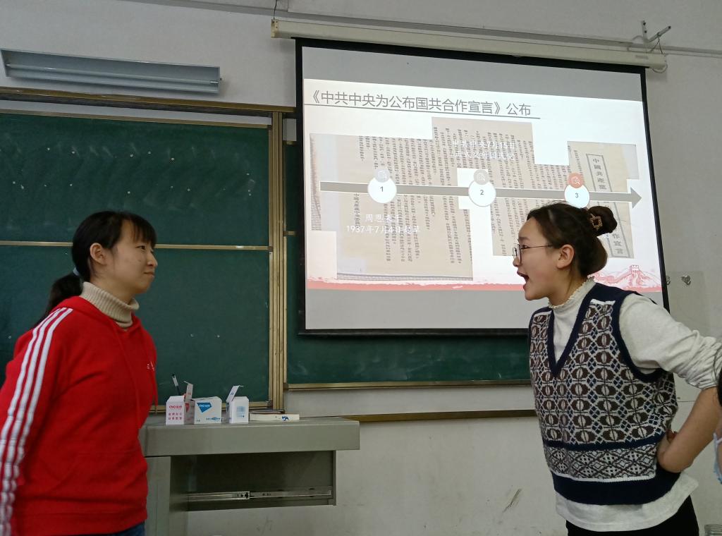 目前小组展示已进行到第五组,同学们各展所长,在思政课堂玩出了新花样,师生在一片欢声笑语中“学史明理”。21级赵倩、郑瑶瑶、严艺等同学或自主制作微电影展示土地革命时期的思想政治教育,或情景扮演胡适和李大钊还原“问题”与“主义”的论辩、或化身抗战时期的热血青年展现一个平凡人的思想转变历程。“在这次自主学习中,我和组员通力合作,提升了我的团结协作能力,并在搜集资料的同时,了解到一些课本之外的知识,更加深化了我对这门课程的理解。”第二组学生付方宇说。