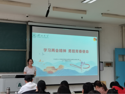 地大马院研究生李紫烨(我院思想政治教育2018级学生)作为代表分别从2023年全国两会、两会新看点、两会精神简述、今年政府工作报告简版,以及青年寄语五个方面展开了充分宣讲。