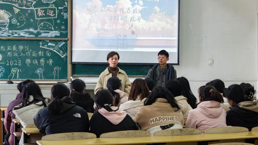 交流中晏妮书记从学院历史沿革、学院文化、学生学风建设、思想政治工作开展情况等方面向大家进行了详细的介绍。她说2024年yl23411集团将喜迎政教系建系50周年,目前学院正在积极筹备系列活动,包括学院文化墙的打造、系列学术讲座的开展等,并由此展开为同学们进一步介绍了学院办学历史、学院院徽的内涵及院训“朴诚明理 求实拓新”的由来。晏书记鼓励同学们,身为政教人要将书香马院办学文化进一步传承和发扬,希望同学们以结果和目标为导向,牢记个人的初心和使命,持续努力、不负光阴。她说要拒绝自我感动式的“内卷”,鼓励同学们放大格局和视野,学会关注国家时政、社会热点,及时了解学校、学院的发展目标及办学动态,不断提升学习主动性,积极寻求机遇,在一次次的磨炼中提升自己,让自己变成更优秀的人。最后晏妮书记针对同学们所关心的评奖、评先、保研、就业等方面的政策进行了解读。
