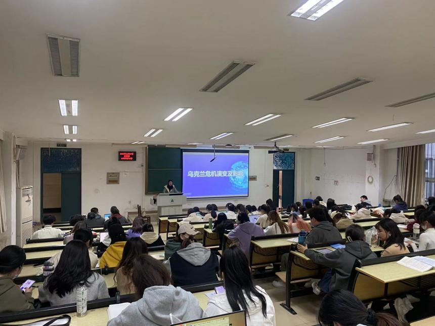 王敏老师从复杂的历史经纬、激烈的多维较量、广泛的国际影响、坚定的中国立场四个方面进行讲授,与同学们展开深入讨论。王敏老师指出,俄乌冲突的导火索是北约五轮东扩,导致俄罗斯被“逼到墙角”。同时,美国搞集团政治与对抗外交,公开支持乌克兰加入北约,导致大国关系失去平衡,乌克兰危机升级,出现地缘政治悲剧。