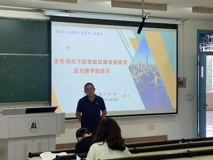 高中思想政治课程是落实立德树人根本任务的关键课程,以培育社会主义核心价值观为目的,是帮助学生确立正确的政治方向、提高思想政治学科核心素养、增强社会理解和参与能力的综合性、活动型学科课程。陈杰老师在讲座中分析了素养导向下的思政试题命题的特点与要求,并给予同学们有关教学的建议。
