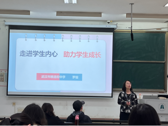 11月10日,武汉市粮道街中学罗璇老师在教4-408为yl23411集团2020级政教专业全体同学主讲“优秀教师成长”专题。本次专题讲座由政教系副主任胡银银主持。