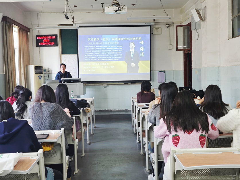 (通讯员:郑蓉)2025年3月21日下午,荆州中学政治高级教师甘海涛老师受邀为我院 2024 级学科教学(思政)研究生举办专题讲座。 讲座由我院学科教学(思政)专业负责人姚迎春主持,2024 级学科教学(思政) 专业全体研究生参加。