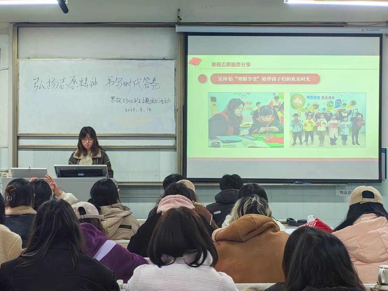 团支书王卓越概述了雷锋同志的成长历程与精神内核,着重强调在新时代背景下弘扬雷锋精神的重要意义。随后,她邀请同学们分享雷锋同志的先进事迹,同学们踊跃发言,说出自己熟悉的雷锋故事,并通过聆听他人的想法加深对雷锋精神的理解。