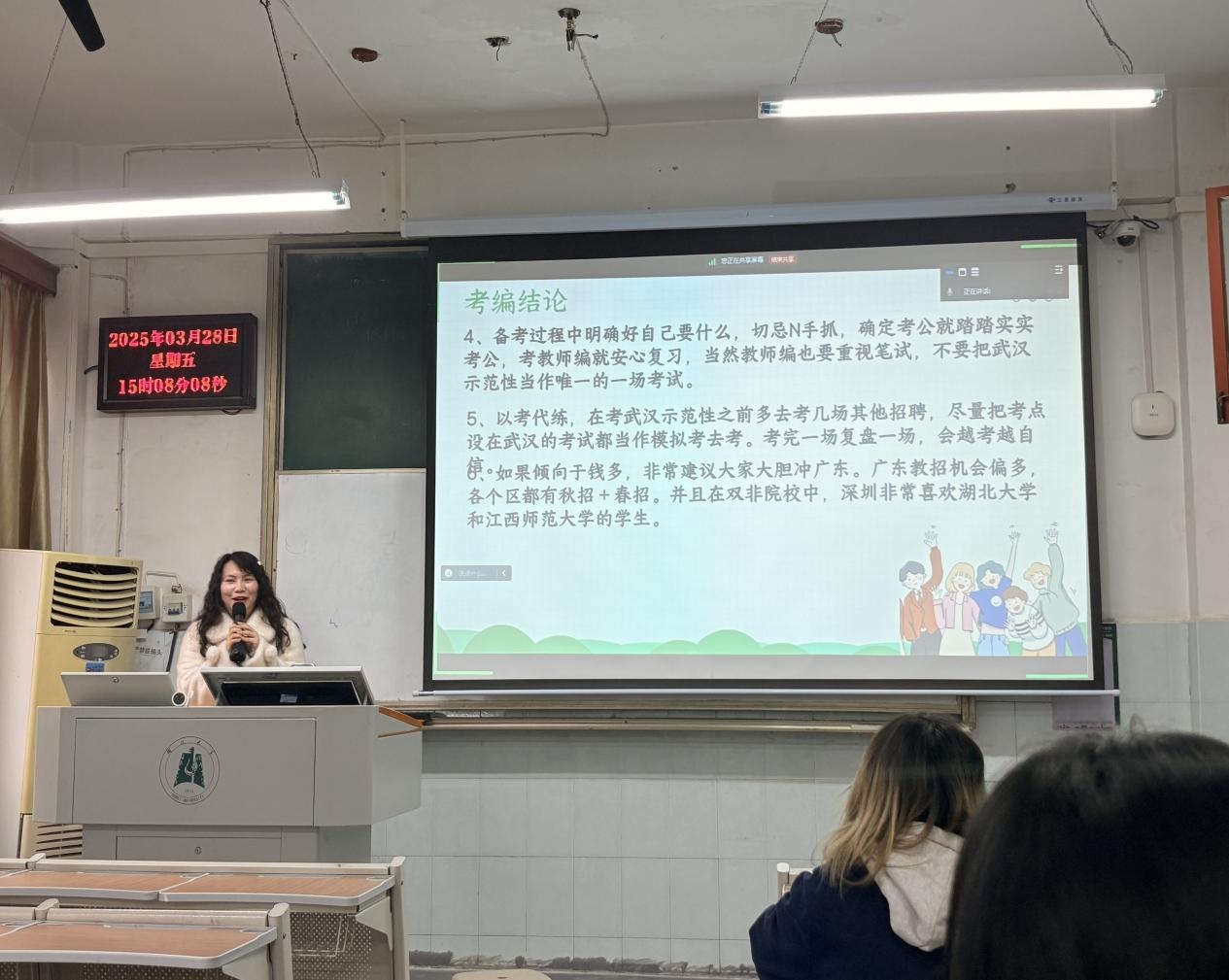3月28日下午,吴琼同学围绕武汉示范性学校专项招聘相关事宜,从考试基本情况介绍、结构化备考、试讲备考等几方面为同学们作出详细分享。吴琼向大家分享了自身备考过程中的经验以及遇到的问题,并告诫同学们在备考时要踏踏实实,保持良好的心态,学会用行动打败焦虑。