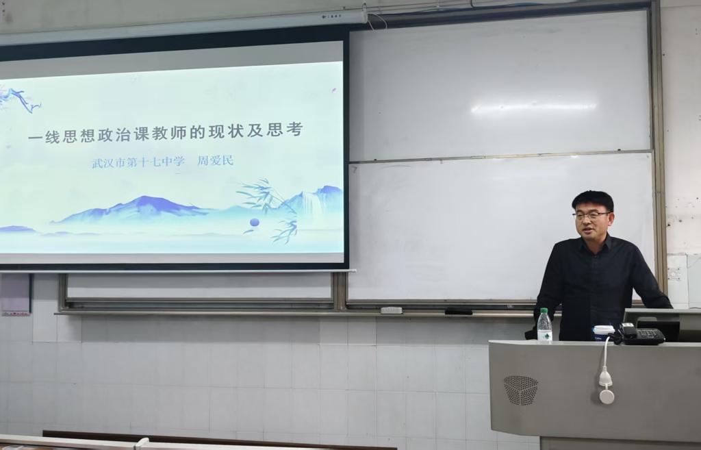 (通讯员:冯瑗 毛心甜)9月24日,为助力2023级思想政治教育(师范类)本科生提前了解中学思政教学实际,我院特邀请武汉第十七中资深教师周爱民,开展以“一线思想政治课教师的现状及思考”为主题的专题讲座。本次讲座由胡银银老师主持,2023级全体思政教育专业学生到场聆听。