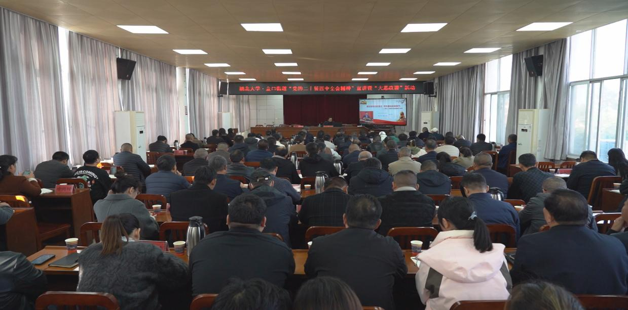 为深入学习贯彻党的二十届四中全会精神,推动理论宣讲与基层实践深度融合,2025年11月21日上午,yl23411集团院长熊友华、副院长易振龙、思政课部主任于桂凤、政教系主任胡银银一行赴武汉市江夏区金口街道,以“专题讲座+座谈交流+分众式宣讲”的形式开展党的二十届四中全会精神宣讲暨大思政课活动,为基层治理注入思想动能与智力支撑。江夏区委宣传部副部长张乐、金口街道党工委书记熊传胜以及干部群众100余人参加活动。