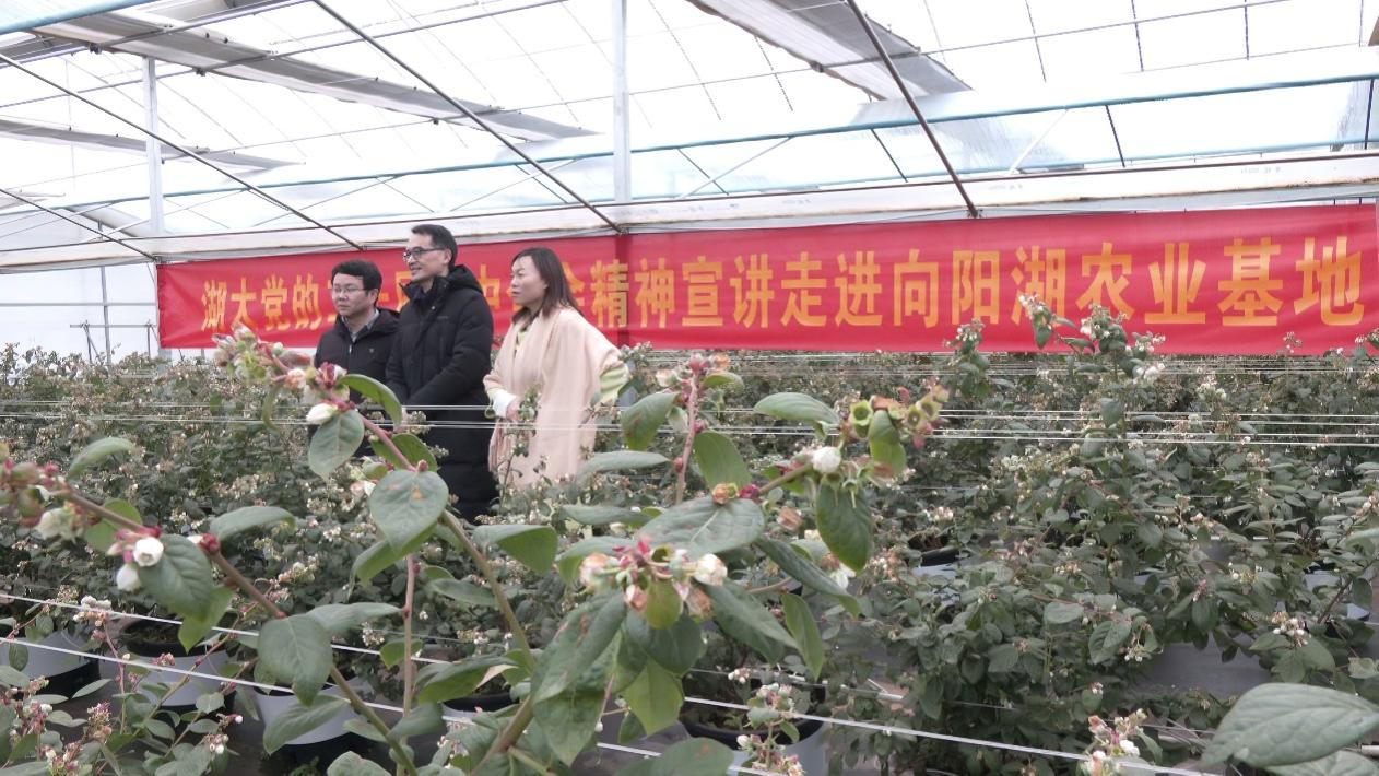 在向阳湖农业科技产业园蓝莓种植基地,学院党委书记李中伟与园区工作人员、种植户亲切交流,共话农业产业发展新思路,探讨党建引领与产业振兴融合新路径。与此同时,胡艳华教授以“加快农业农村现代化,推进乡村全面振兴”为主题,在大棚基地开展联袂宣讲,她结合当地农业特色,生动解读全会关于乡村振兴的战略部署。宣讲结束后,胡艳华教授协同我院硕士生导师燕红亮和研究生熊智勇围绕“一二三产业融合助力乡村全面振兴”主题开展实地调研,与农户、企业代表座谈,深入了解产业现状与发展需求,为课题研究积累实证资料,为理论联系实际积累鲜活素材。下午,胡艳华教授、燕红亮老师和熊志勇继续深入广东畈村开展座谈调研。