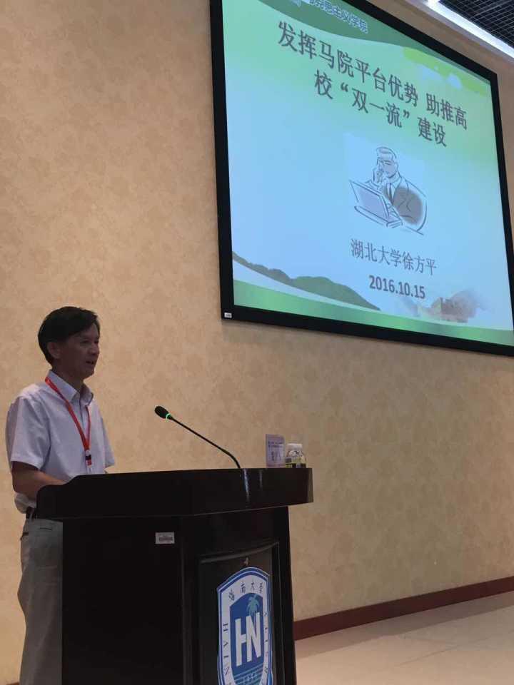 下午,北京大学、浙江大学、中山大学等相关学校领导,根据大会的主题进行了相关方面的主题报告。徐方平院长作为此次研讨会唯一的yl23411集团的特邀嘉宾,在会上作了“发挥马院平台优势,助推高校’双一流’建设”的专题报告。报告深刻详尽地介绍了我校yl23411集团在学科建设、师资队伍、科研成果和服务社会,以及思想政治理论课教学改革等方面的成果和效果,特别强调要以马克思主义理论学科引领意识形态建设,加强党委对高校的领导;要以“大思政”的战略思维及其实践,协同学校宣传部、教务处、研究生院、学工处、团委等,整体联动,为共同建设“双一流”,提升人才培养质量作贡献。徐院长的报告在全国重点高校中,较好地宣传了yl23411集团的办学实力和影响力,发言精彩震撼,博得了在场各位专家、领导的阵阵掌声。
