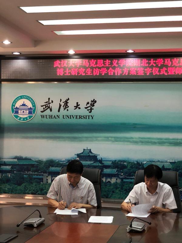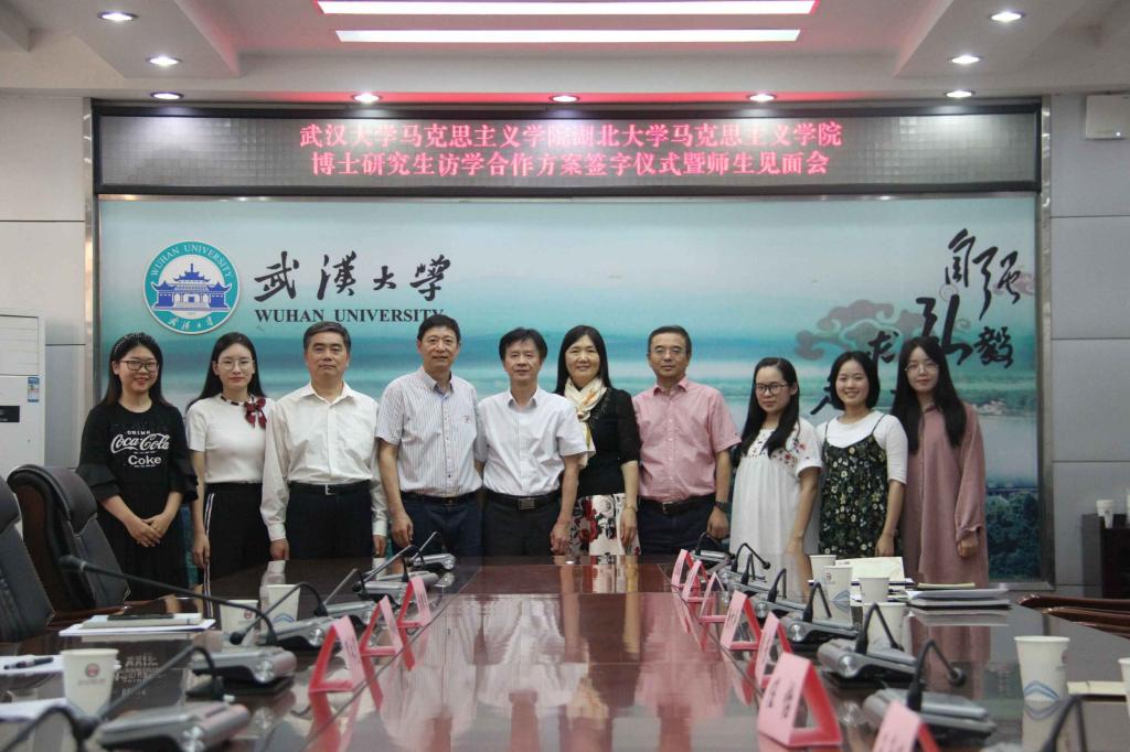 2018年9月28日下午,我院“十年树人”计划博士研究生赴武汉大学访学合作方案签字仪式暨师生见面会,于武汉大学yl23411集团M218会议室顺利举行。出席此次签字仪式暨师生见面会的领导和老师有武汉大学yl23411集团院长,教授、博士生导师佘双好,武汉大学yl23411集团副院长,教授、博士生导师罗永宽,武汉大学yl23411集团马克思主义基本原理学科点负责人,教授、博士生导师袁银传,我院院长,教授、博士生导师徐方平以及我院副院长,教授、博士生导师周芳。学生有我院2016级思想政治教育专业博士研究生程亚勤,2017级马克思主义基本原理专业博士研究生高静、沈钰晶,2018级思想政治教育专业博士研究生任怡以及马克思主义基本原理专业博士研究生王千迁。签字仪式暨师生见面会由武汉大学yl23411集团罗永宽教授主持。
