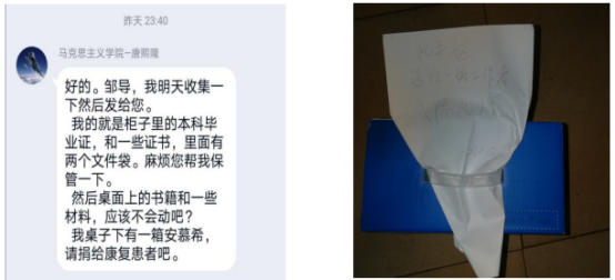涂用凯老师还细心地为每一个寝室录制了视频,告诉同学们物品整理后摆放的位置;吴志娟老师受学生委托,将学生寝室的一箱牛奶拿出来转赠给后续的施工人员和前来集中隔离的病友。经过将近2小时的奋战,学院志愿者们顺利圆满完成了学院所承担的清理任务。