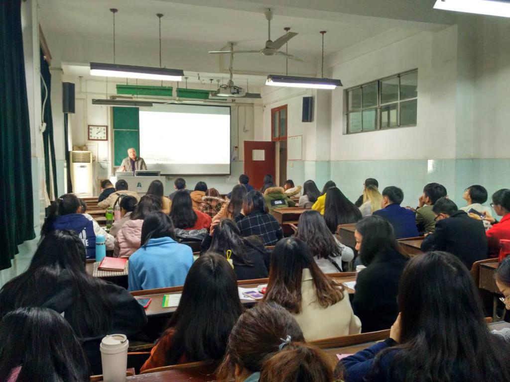 为深入学习宣传贯彻十九大精神, 11月22日下午2点,院党委书记汤德森在教2-411教室主讲题为“新时代 新思想 新征程——学习党的十九大精神体会”的党课报告,全体学生党员以及第8期党校入党积极分子到场聆听报告。