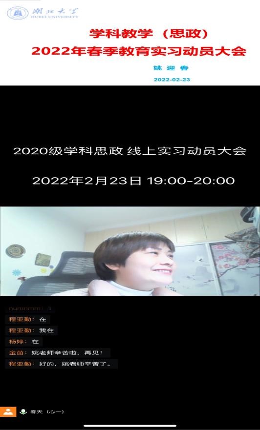 为确保疫情期间我院教育硕士2022年春季学期的实习工作顺利推进,2022年2月23日晚上7点,我院召开了2020级学科教学(思政)专业线上实习动员大会。会议由学科负责人姚迎春主持,校内指导老师杨婷、程亚勤以及2020级学科(思政)专业全体同学参加。