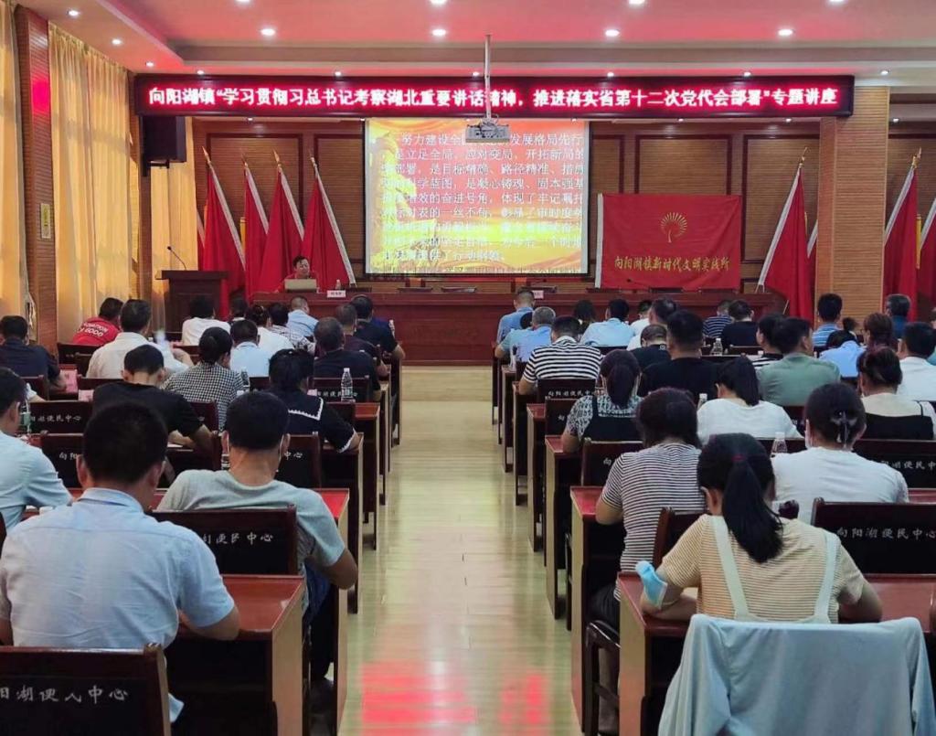 (通讯员:孙颖)2022年7月22日,咸宁市咸安区向阳湖镇举行“学习贯彻习近平总书记考察湖北重要讲话精神,推进落实省第十二次党代会精神部署”专题会议。yl23411集团杨海军老师以“建设先行区 谱写新篇章”为题进行了理论热点面对面宣讲。咸安区委宣传部副部长熊鸣、向阳湖镇党委书记陈伟、镇长周永定等全体镇干部、驻村工作队、镇直部门负责人、村两委成员参加会议。