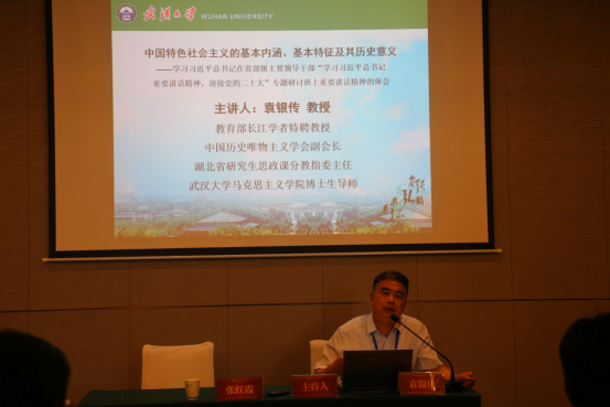 在会议的第一阶段,湖北省研究生思政课分教指委主任、教育部长江学者特聘教授、武汉大学yl23411集团袁银传教授作了题为《中国特色社会主义的基本内涵、基本特征及其历史意义——学习习近平总书记在省部级主要领导干部“学习习近平总书记重要讲话精神,迎接党的二十大”专题研讨班上重要讲话精神的体会》的主旨报告。湖北省研究生思政课分教指委副主任、华中师范大学yl23411集团副院长毛华兵教授作了题为《习近平新时代中国特色社会主义思想对马克思主义的原创性贡献》的主旨报告。