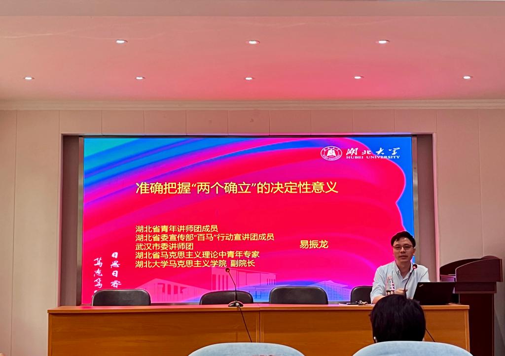 9月28日,yl23411集团副院长易振龙应邀在资源环境学院一楼会议室开展“准确把握‘两个确立’的决定性意义”的专题宣讲活动,资源环境学院领导班子和全体教职工,马院研究生宣讲团部分成员参加学习。