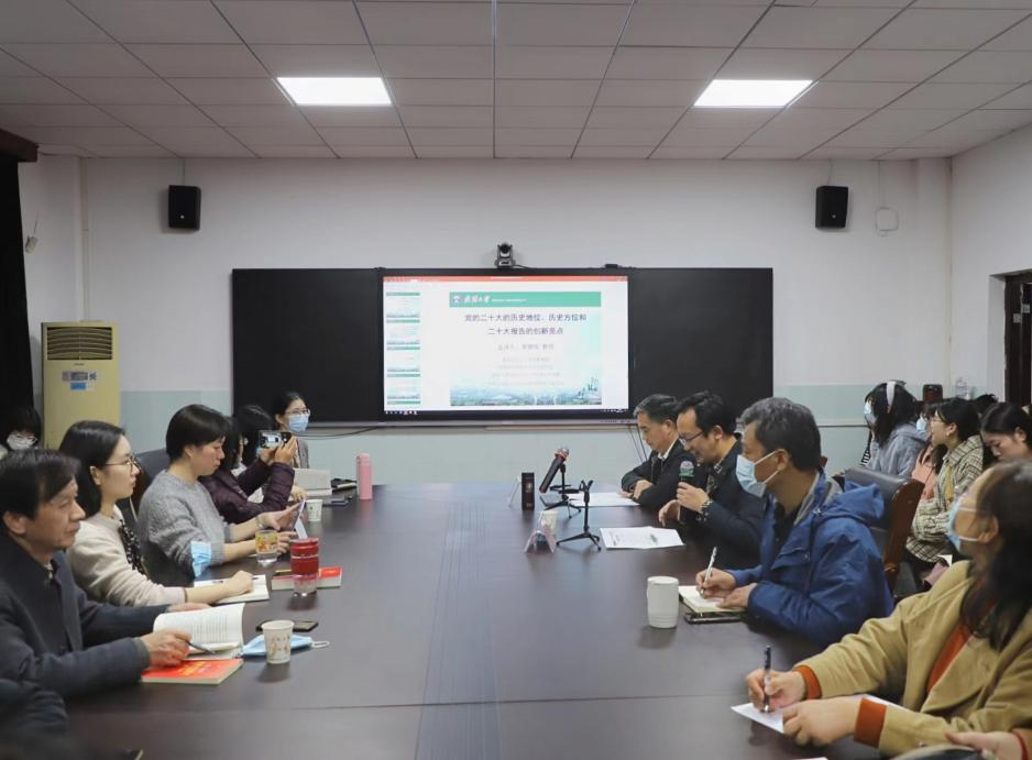 2022年11月17日,教育部长江学者特聘教授、武汉大学yl23411集团袁银传教授在学院四楼2号会议室以《党的二十大的历史地位、历史方位和二十大报告的创新亮点》为题,宣讲党的二十大精神。学院教师和马克思主义理论专业的硕士及博士研究生参加报告会,学院院长熊友华教授主持报告会。