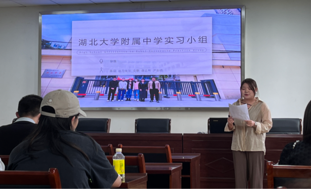 各实习小组代表上台汇报实习成果,分享此次教育实习工作中的经验与心得体会,总结实习过程中遇到的问题与不足之处,并对未来的学习和工作进行展望。